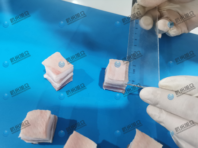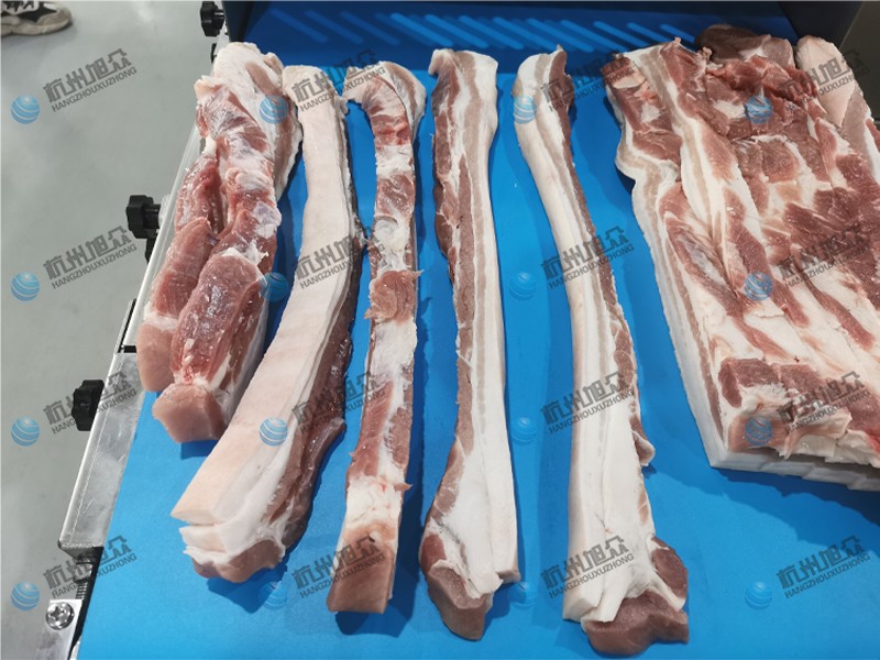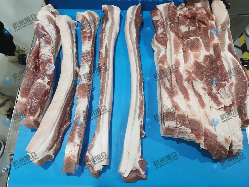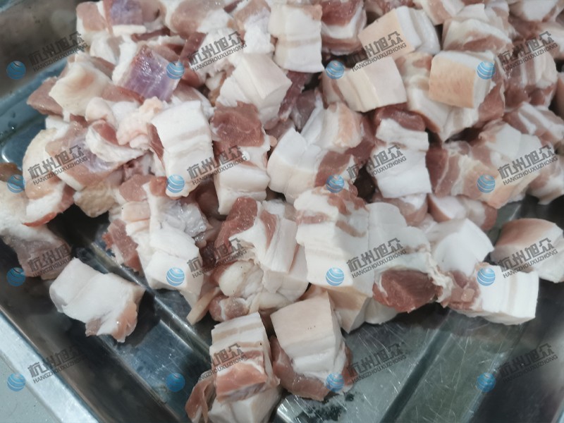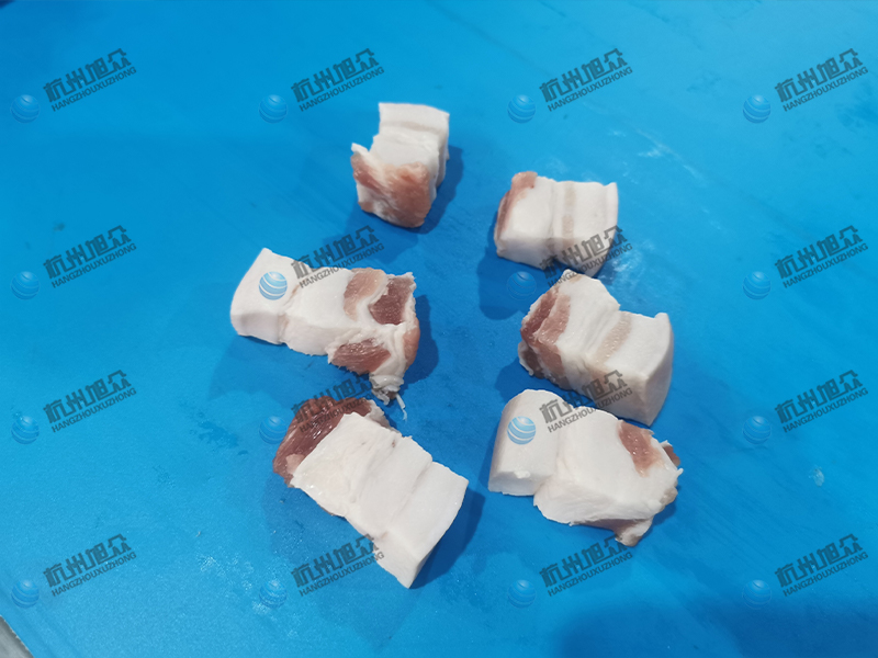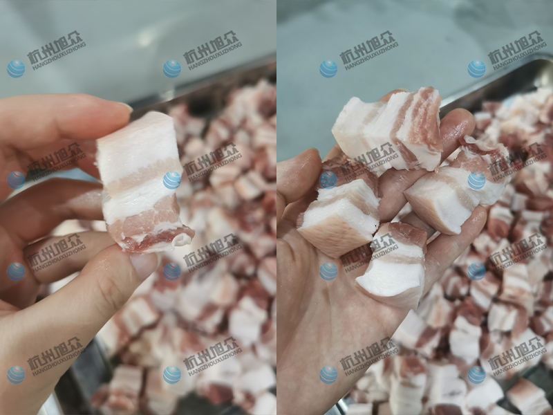 這款機器外形尺寸是1700*780*1310mm,傳送帶寬度(入料)約為500mm ,  入料高度約為100mm,加工尺寸6-50mm(可定制),生產(chǎn)能力每小時可約切割1500-2000Kg,產(chǎn)量巨大,適合很多大型肉制品加工廠使用,可以節(jié)約大量人力去切肉,省去很多成本,還不會有人員受傷情況的發(fā)生。非常安全高效,下面是我們試機的成果展示: